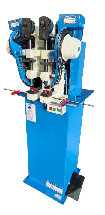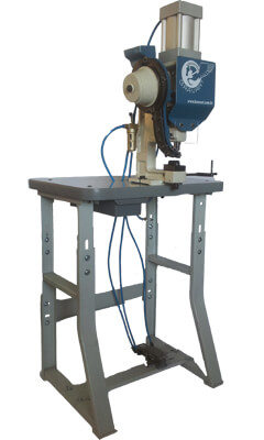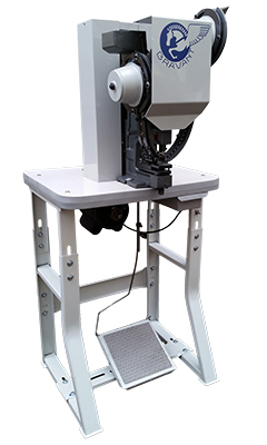 Equipamento composto de dois carregadores automáticos, que possibilitam a aplicação de ilhós c/ arruela no mesmo acionamento, comandada por motor elétrico, acionada por pedal.